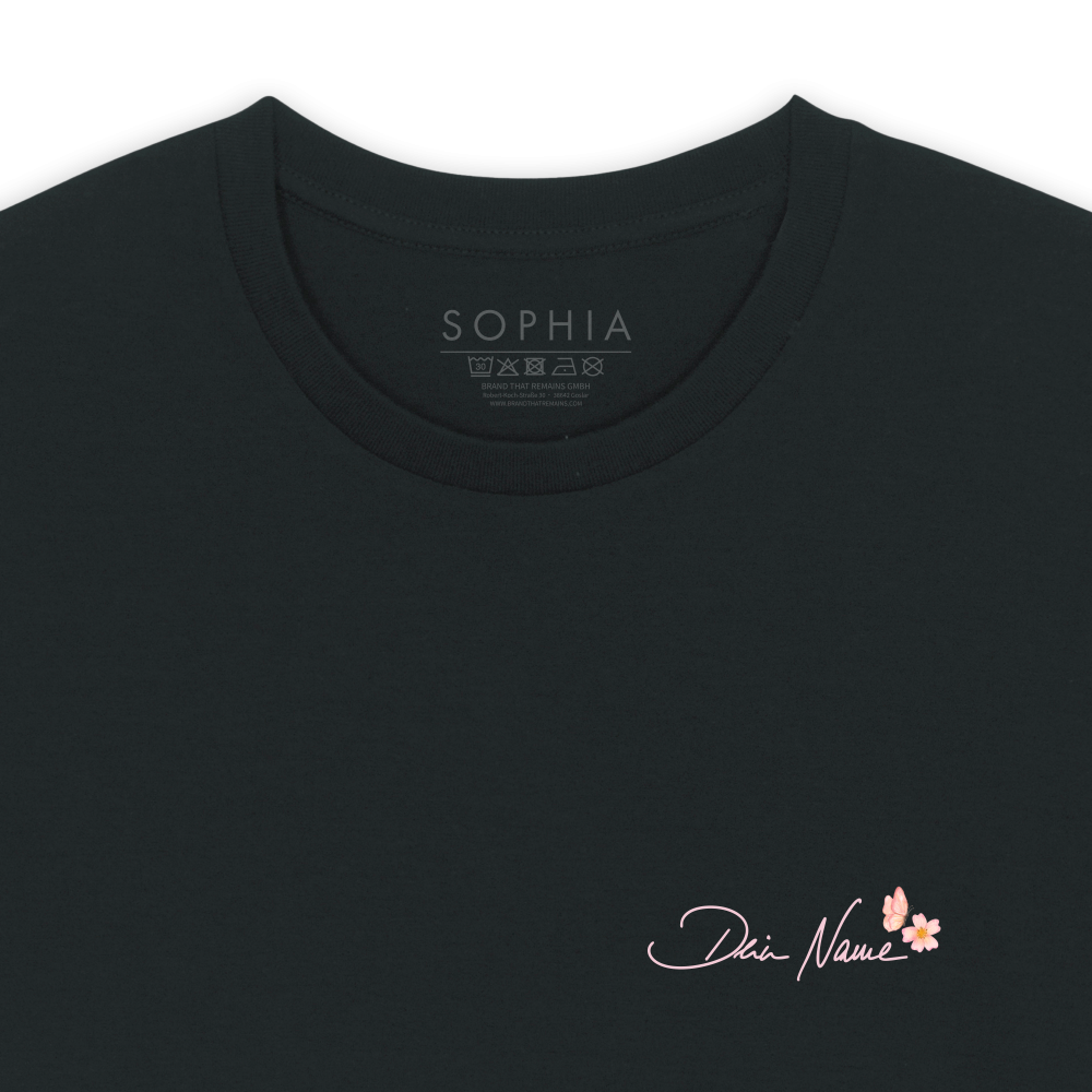 Im Feld oben kannst du deinen Vornamen oder Spitznamen (ein Wort) eingeben – SOPHIA schreibt ihn persönlich per Hand, und genau so wird er anschließend auf dein Shirt gedruckt.